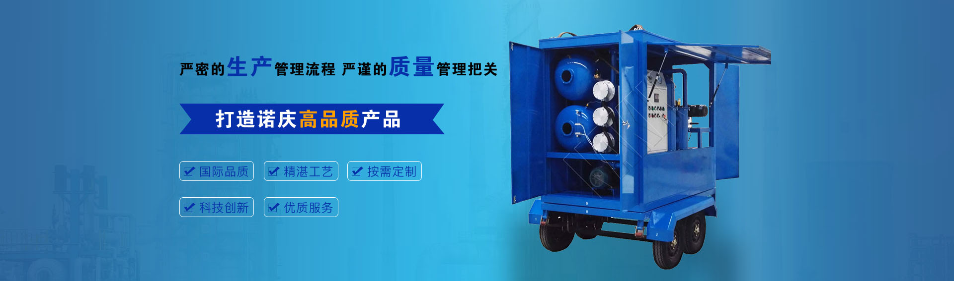 公司通過ISO9001-2015質(zhì)量管理體系認(rèn)證,CE歐盟認(rèn)證,諾慶公司所有濾油機(jī)配套產(chǎn)品均采用國(guó)內(nèi)外知名品牌,經(jīng)過多年的使用,具有質(zhì)量可靠,性能優(yōu)良。公司擁有完備的檢測(cè)儀器和檢測(cè)設(shè)備,所有產(chǎn)品出廠前經(jīng)過嚴(yán)格測(cè)試,保證每一臺(tái)產(chǎn)品合格出廠。